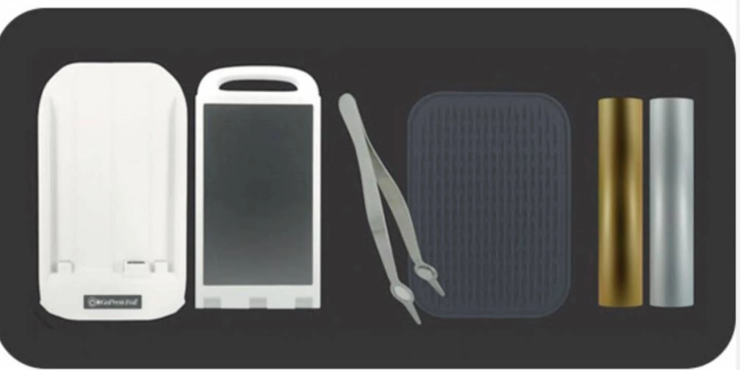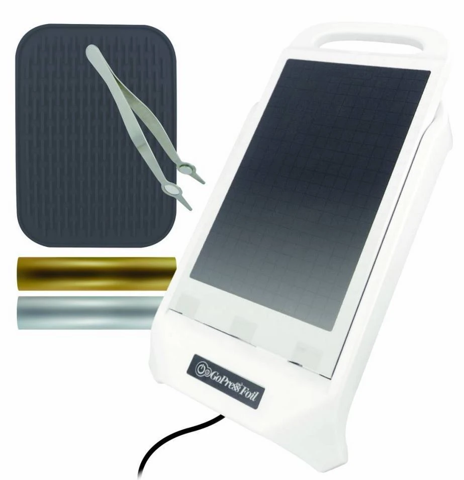 Die Go Press and Foil Machine ist eine elektronische Maschine die mit Hilfe von metallic Folien( hier im Shop erhältlich) Metalleffekte erzeigen kann. Die Maschine hat ein abnehmbares Teil das kompartibel zu den gängigsten Stanzmaschinen ist.